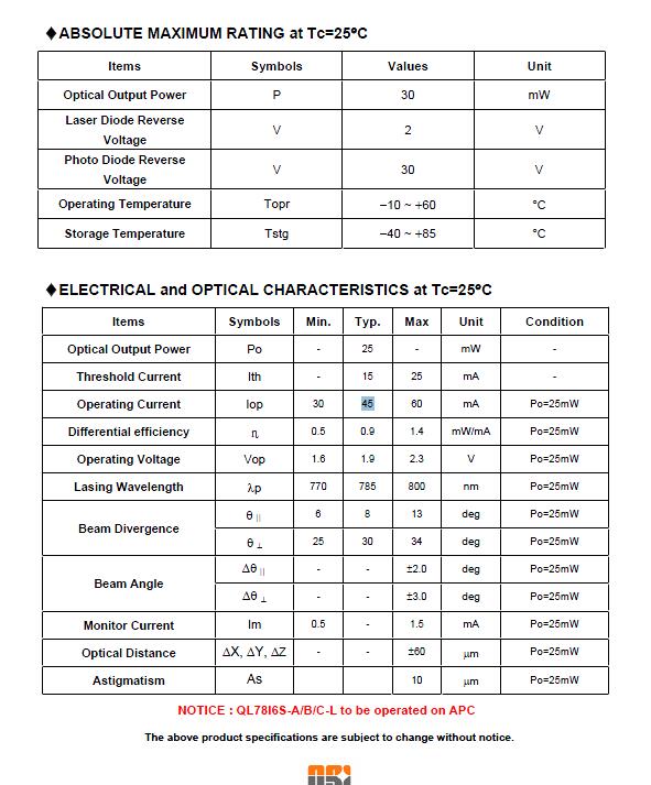 QL78I6S-A/ B/ CL是量子一个MOCVD生长780nm的频带的AlGaAs激光二极管以及